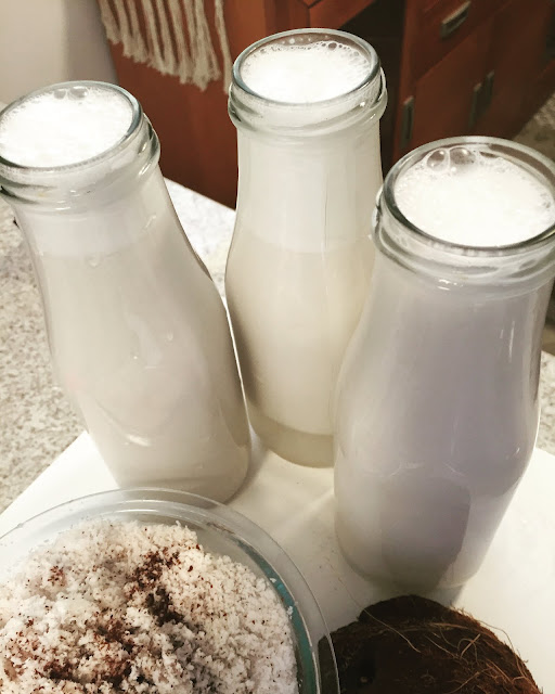 Leite de coco feito por mim. Uso para fazer mingau, bolos, tomar com café ou colocar em smoothies
