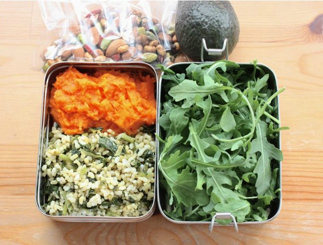 Arroz, algas com cenoura, soja e tofu frito, cogumelos com molho de tofu e gengibre, brócolis, omelete de espinafre e queijo, abóbora e rabanete .Fonte: tivi.blog32